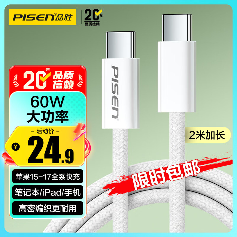 品胜苹果17promax充电线双type-c数据线PD60W快充ctoc车载通用iPhone1615小米华为P80手机iPad笔记本2m