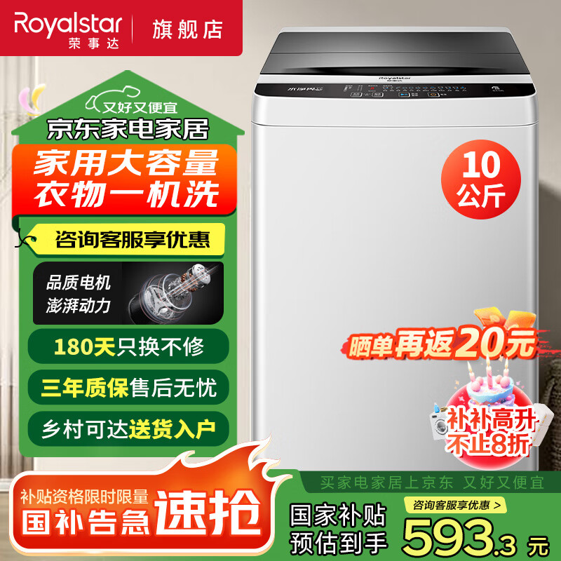 荣事达(Royalstar)10公斤全自动洗衣机大容量波轮家用租房节能一键脱水 10KG 澎湃动力 一次洗净