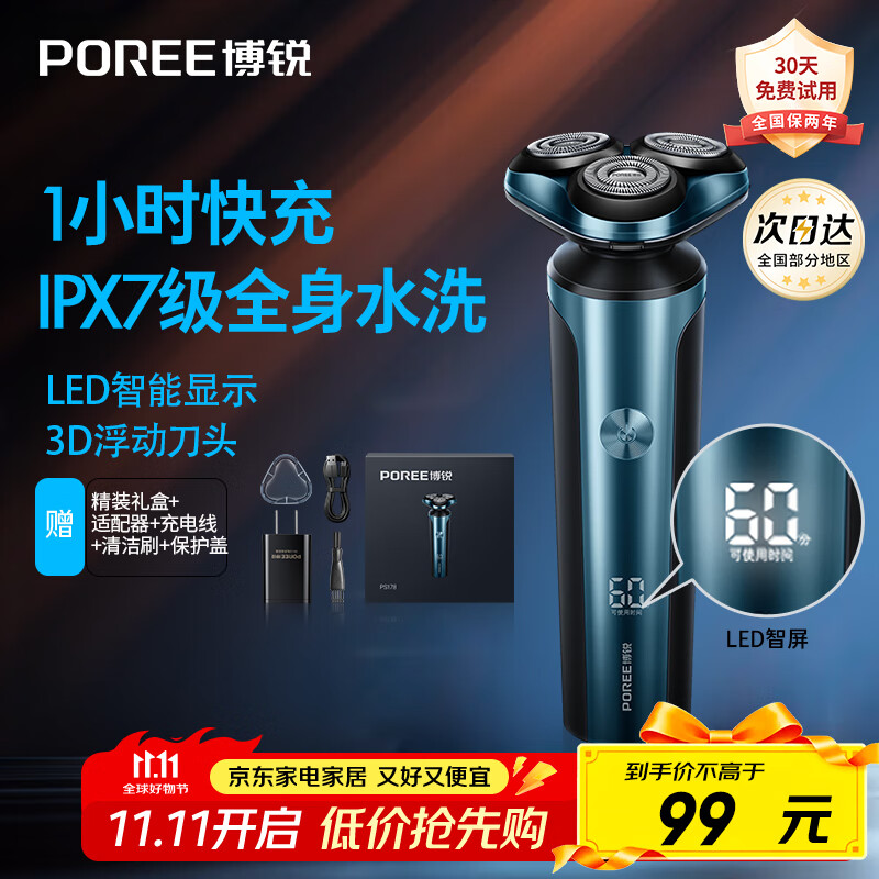 飞科博锐电动剃须刀男士便携刮胡刀旋转式全身水洗车载快充LED数显三头即插即用须刨送男友生日礼物 【赠适配器】极光蓝智能LED屏显PS178