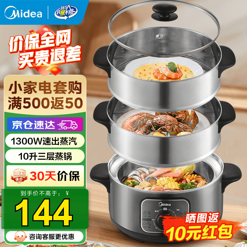 美的(Midea)电蒸锅电火锅电煮锅 多用途锅 电热锅 多功能蒸煮锅蒸包子锅煮蛋器上蒸下煮三层大容量不锈钢机身 10L ZG26EASY401【国家补贴】 旋钮调节