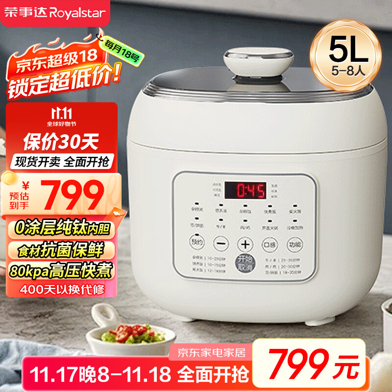 荣事达(Royalstar)电高压锅0涂层电压力锅家用5-6人钛釜更抗菌电压锅80kPa开盖煮多功能预约5L大容量YDG50-100A221T
