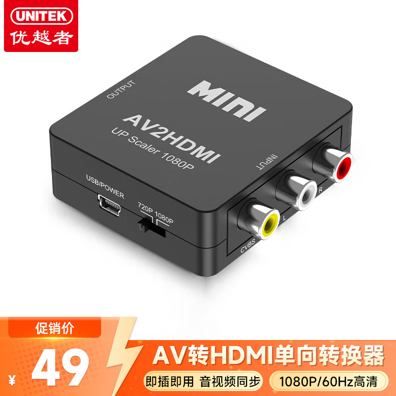 优越者AV转HDMI转换器红白黄三色色差接口转接高清hdmi接口1080P视频转换老机顶盒DVD电视显示器V1194A