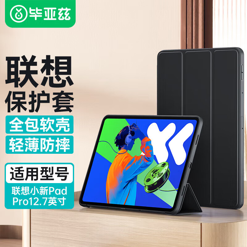 毕亚兹适用2025款联想小新Pad Pro 12.7保护套 联想平板12.7英寸电脑保护壳 三折支撑全包 PB538-金刚黑