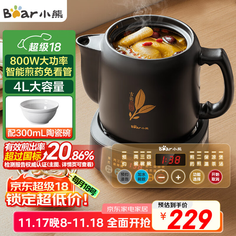 小熊(Bear)中药壶 煎药壶 全自动免看管中药锅 家用分体式陶瓷药罐熬药壶文武火变频 4L大容量JYH-S40D1 二煎