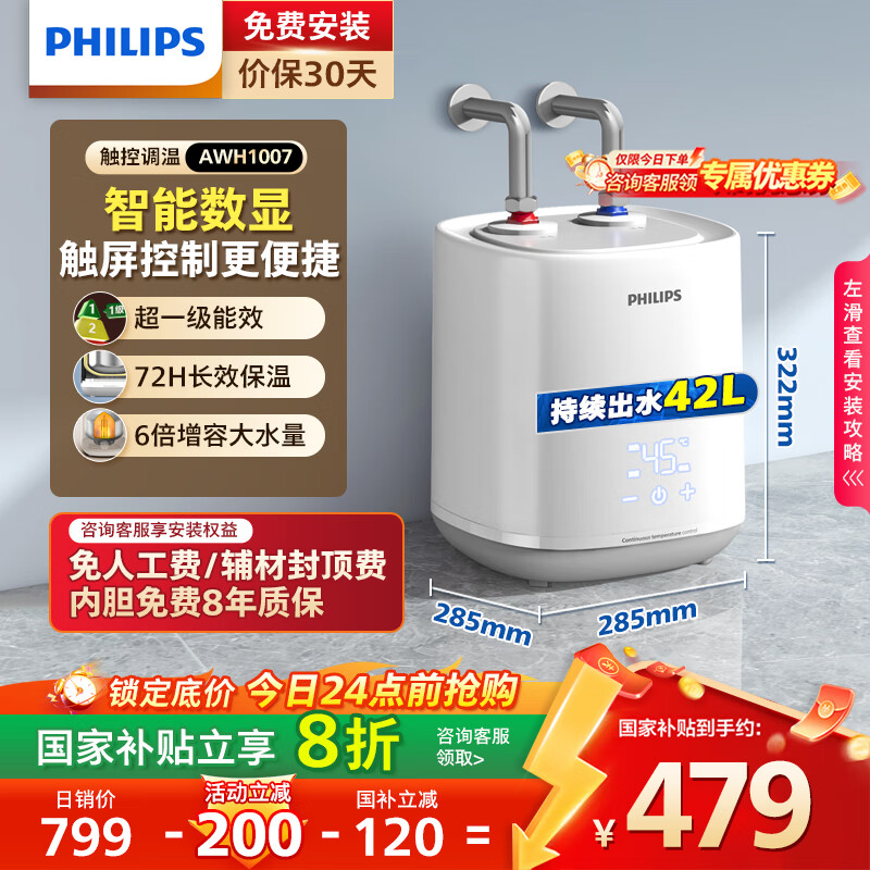 飞利浦(PHILIPS)7升上出水小厨宝 2200W家用厨房速热电热水器 一级能效国家补贴20% 智能数显AWH1007/93(070UB)
