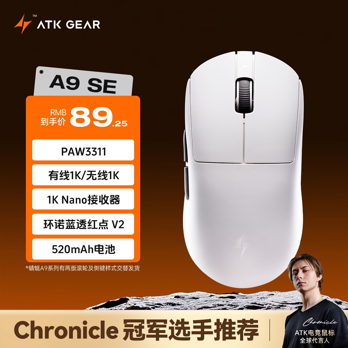 ATK 蜻蜓A9无线鼠标电竞游戏办公鼠标 有线/蓝牙/2.4G/星闪三模连接轻量化对称极简工学 A9 SE 白色
