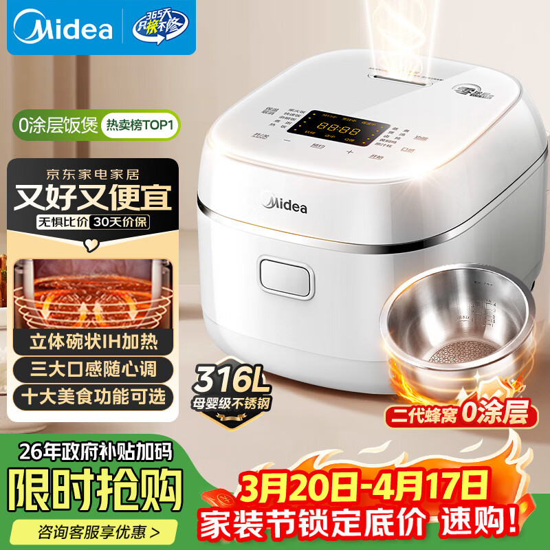 美的(Midea)【政府补贴】电饭煲0涂层家用3L电饭锅不锈钢无涂层蜂窝内胆2-3人IH加热智能多功能电饭煲HC3050S