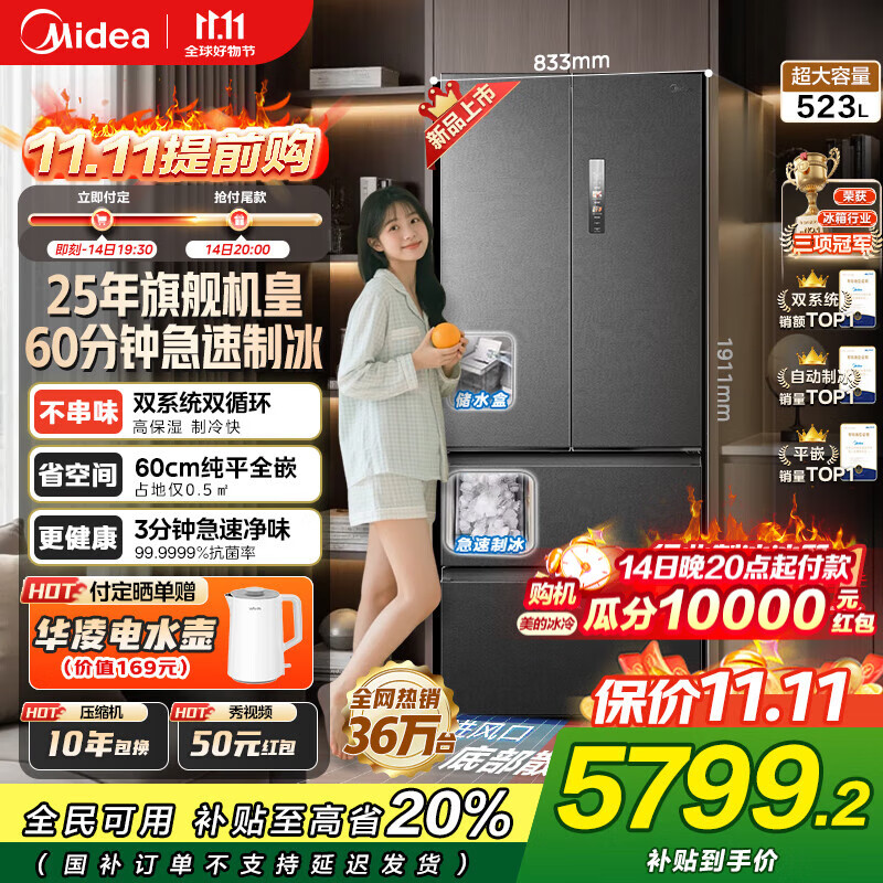 美的(Midea)机皇550法式多门M60系列超薄纯平全嵌一级除菌净味大容量家用制冰一体机冰箱双系统MR-550WUFIPZE MR-550WUFIPZE 海贝黛