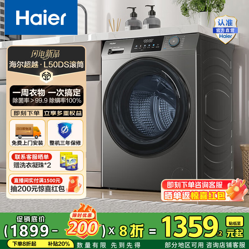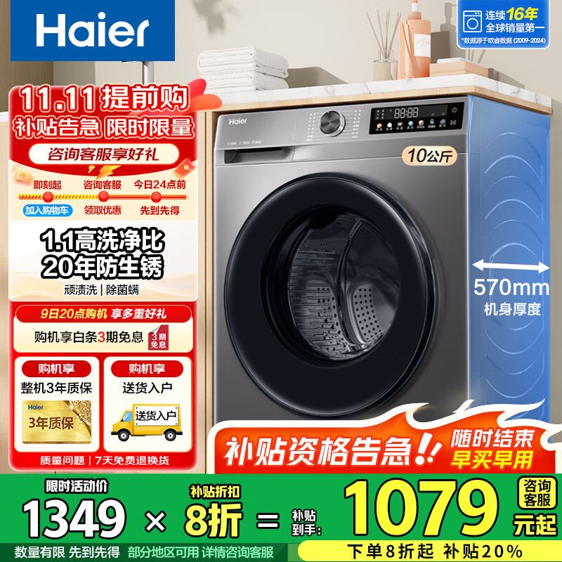 海尔(Haier)洗衣机全自动滚筒变频家用10公斤大容量滚筒洗衣机速洗羊毛洗羽绒洗除菌筒自洁一级能效 标配款【20年防生锈】1.1洗净比+除菌螨+特渍洗