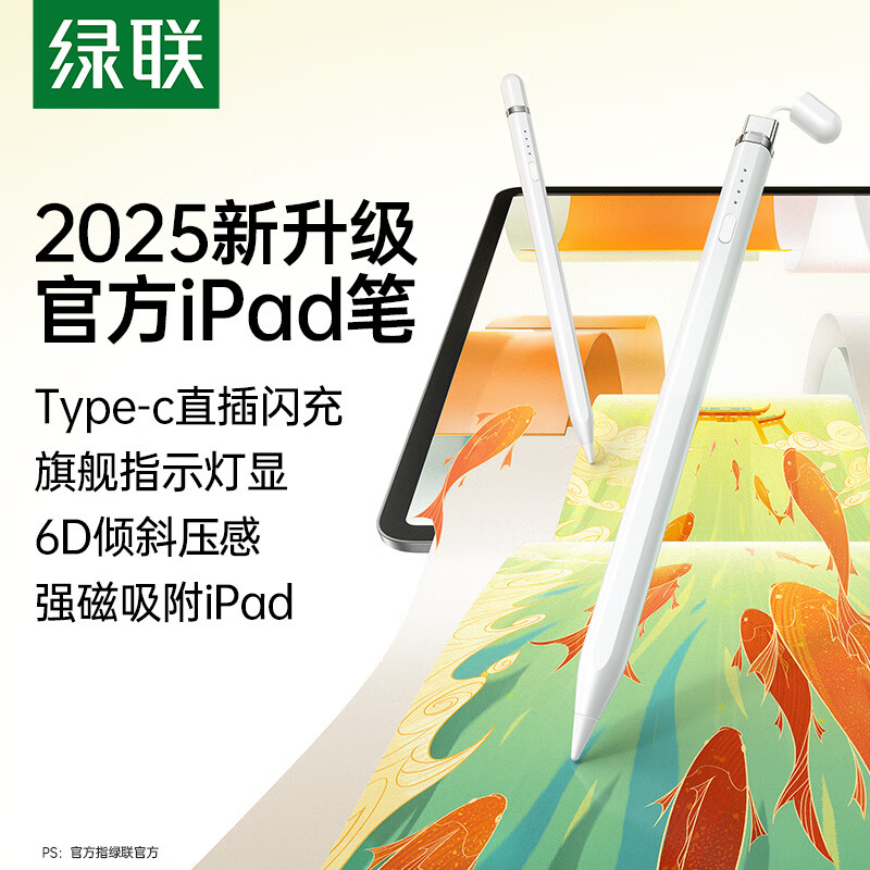 绿联电容笔iPad笔2025新款 苹果笔apple Pencil适用于ipad11/Pro/Air/Mini 平板触控手写笔磁力吸附 【直插TypeC口双充】笔身灯显 | 12h续航