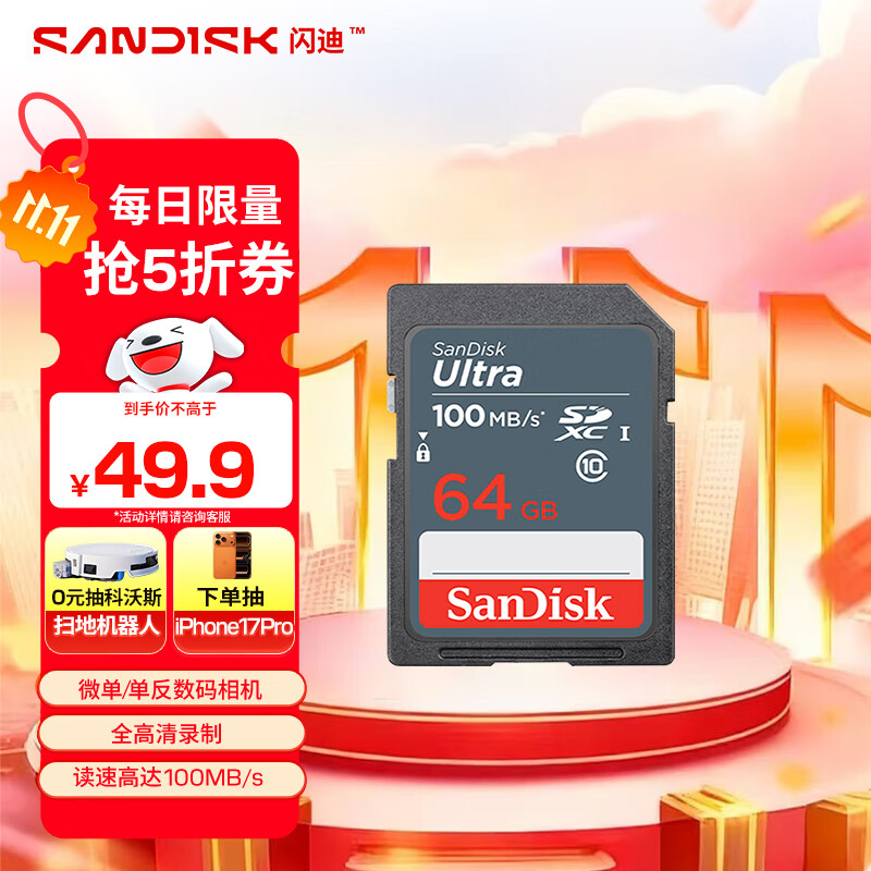 闪迪(SanDisk)64GB SD相机内存卡 C10 拍摄全高清视频 微单/单反数码相机存储卡 坚固耐用 超高性价比