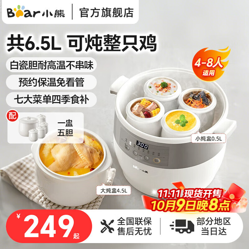 小熊(Bear)电炖锅电炖盅隔水炖4.5升3-4人用 白瓷胆耐高温不串味 双模保温 煲汤锅家用蒸煮一体炖汤盅B45B2 一盅五胆|双保温模式|免看管 4.5L