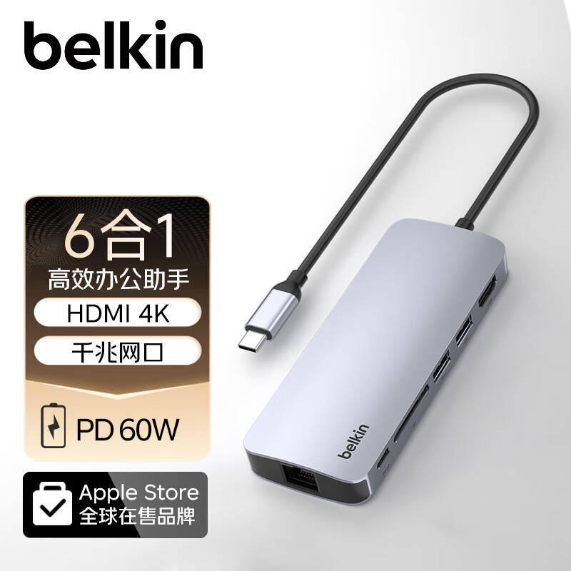 贝尔金(BELKIN)扩展坞type-c USB转接千兆网线6合1 PD供电iPad拓展苹果笔记本电脑HDMI投屏SD读卡 兼容雷电