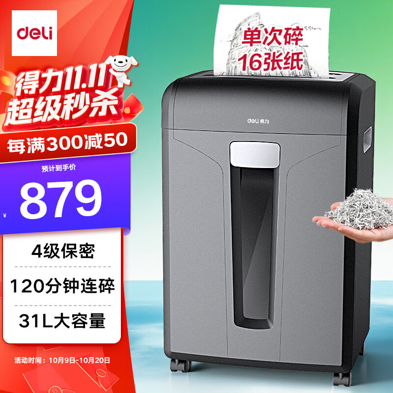 得力(deli)商用办公升级120分钟连碎单次16张大型商务碎纸机家用大吞吐长时间4级碎卡/光盘 27258