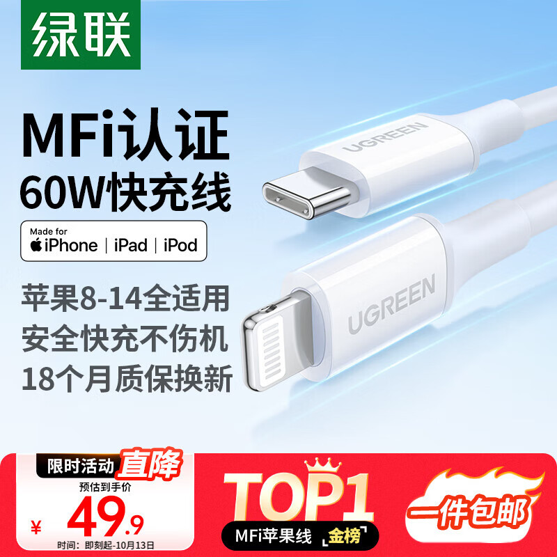 绿联【MFi认证不弹窗】适用苹果充电线Type-C数据线PD60/30/20W快充to Lightning闪电接口iPhone14手机