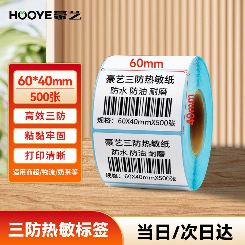 豪艺(HOOYE)三防热敏标签打印纸60*40mm 不干胶条码标签打印纸 500张 HY11872