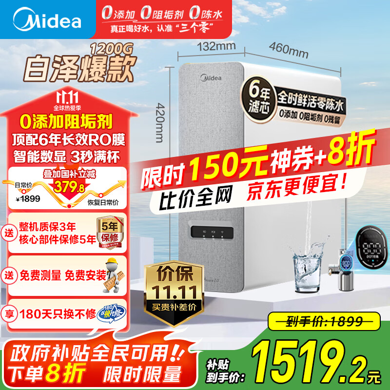 美的(Midea)净水器家用鲜活零陈水净水机白泽6年长效RO反渗透厨下式净水器直饮净饮机 0阻垢剂 1200G