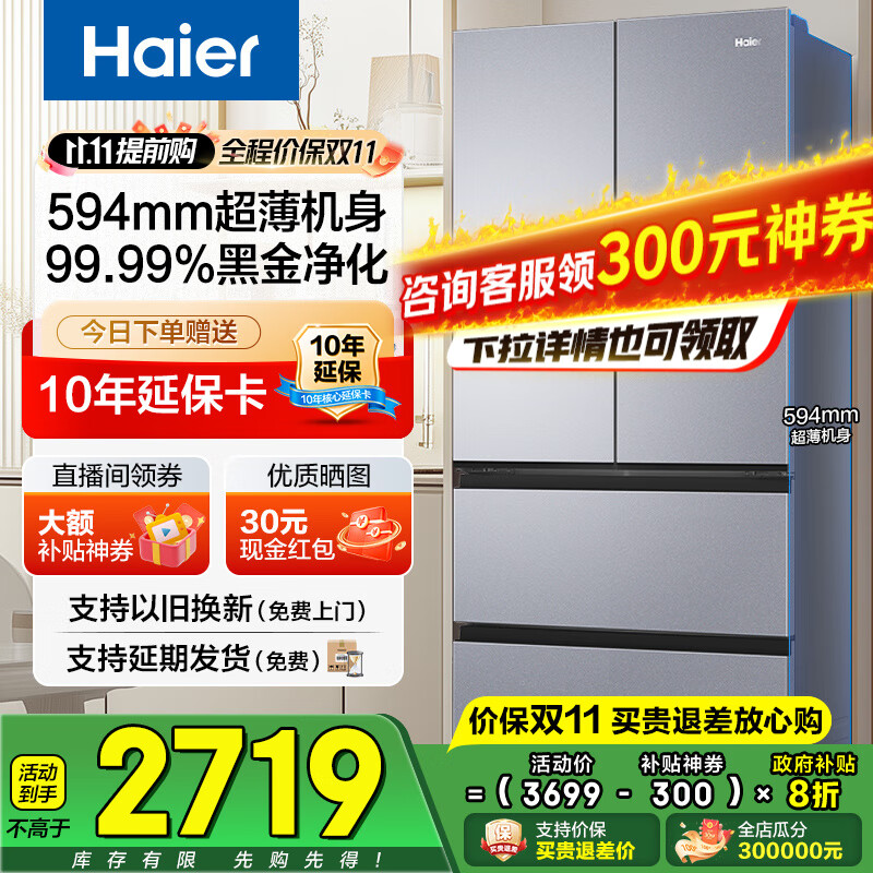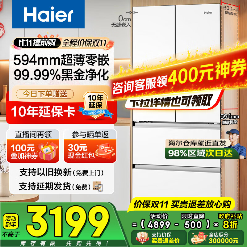 海尔【国家补贴20%】海尔冰箱491L大容量家用电器零嵌法式十字电冰箱风冷无霜超薄594cmm零嵌一级能效 491升超薄零嵌入式冰箱