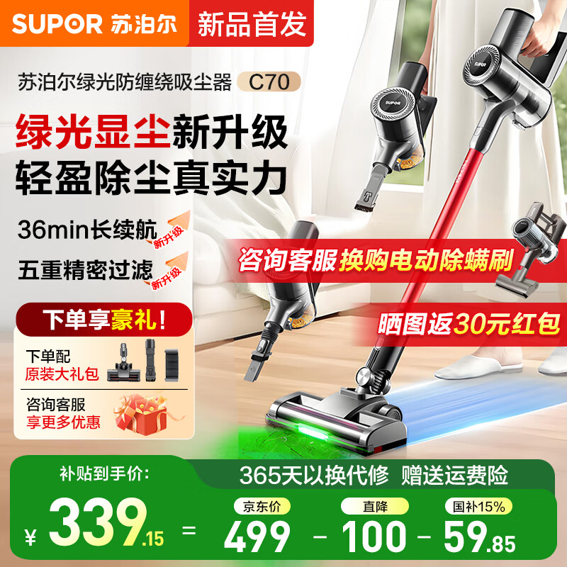 苏泊尔(SUPOR)吸尘器家用手持大吸力无线宠物猫毛狗毛地毯一键倒尘吸尘机充电小型立式吸尘器绿光显尘 【15倍绿光显尘】轻量吸尘器EVS-C70-L