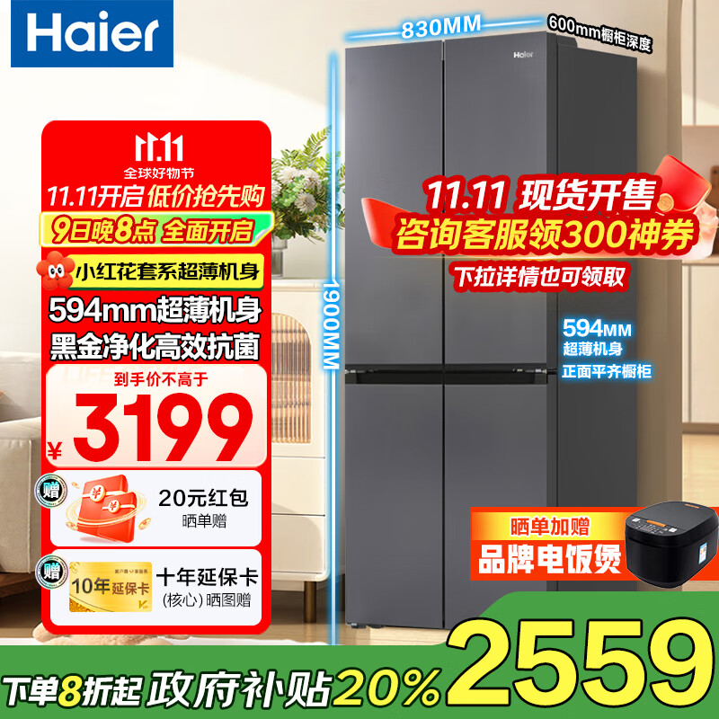 海尔(Haier)冰箱488升十字对开门冰箱无霜一级能效594MM超薄可嵌入式变频家用大容量小红花系列政府补贴20% AI变频科技+黑金净化+三档变温