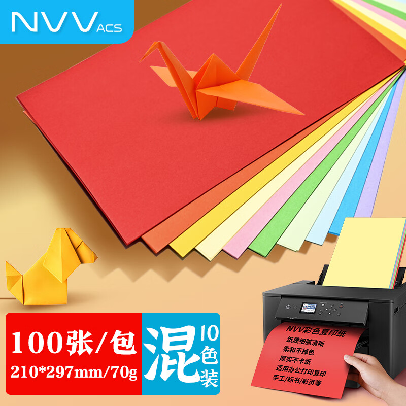 NVVA4彩色复印纸打印纸 70g彩色多色幼儿园儿童手工折纸剪纸彩纸卡纸 10色100张/包 FY-A4混-70