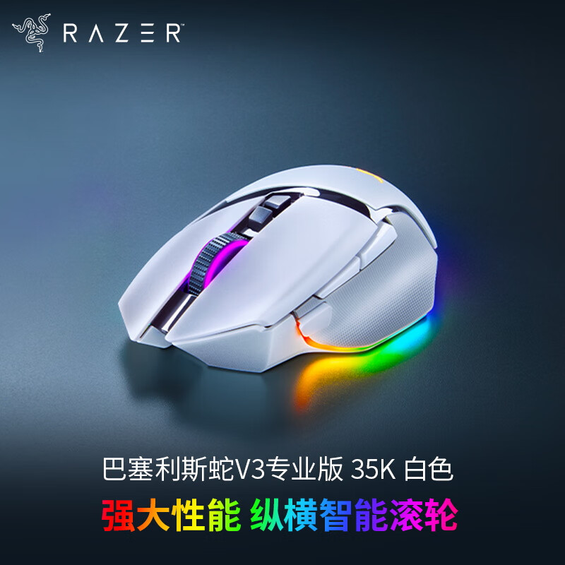 雷蛇(Razer)巴塞利斯蛇V3专业版 35K 无线鼠标 人体工学设计 RGB幻彩灯效 吃鸡/LOL/CS GO游戏 白色