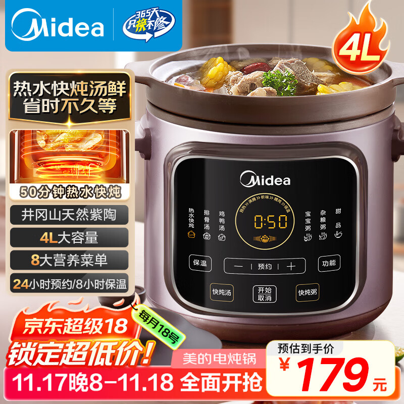 美的(Midea)电炖锅电煮锅电砂锅 炖汤盅电炖盅煲汤炖汤煮粥紫陶锅 4L可定时60min热水快炖一体多功能锅DGE4052