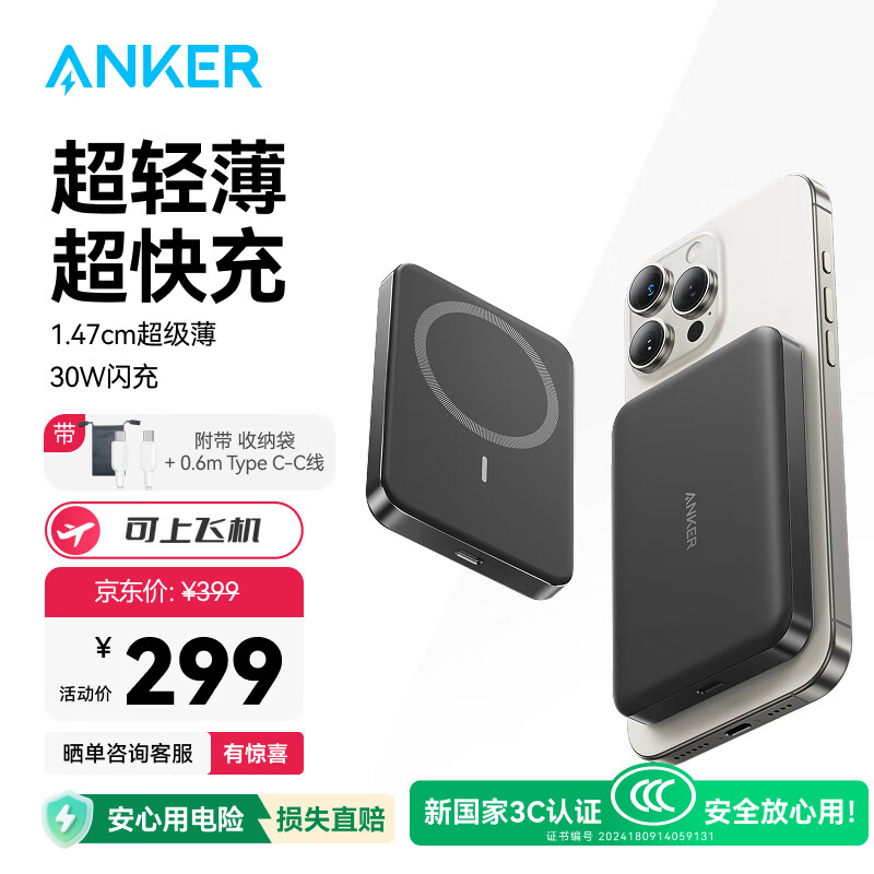 ANKER 安克【新3C认证可上飞机】超薄MagGo磁吸充电宝30W快充大容量10000毫安7.5W无线小巧便携苹果17黑