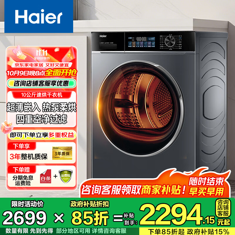 海尔(Haier)527烘干机热泵类家用干衣机10KG滚筒式正反转匀烘衣干即停免熨烫烘衣机 527超薄烘干机(店长主推款)