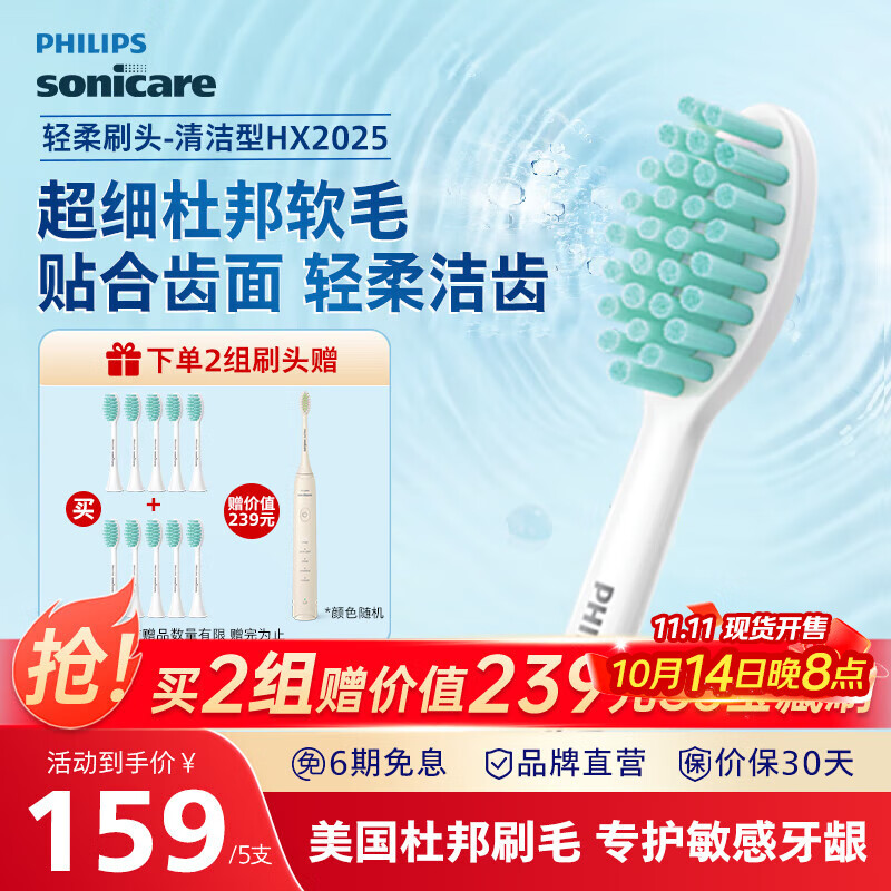飞利浦(PHILIPS)电动牙刷头轻柔洁净型适用2471/2451/2428/2481官方旗舰店 【买2套送牙刷】杜邦刷毛-HX2025/02