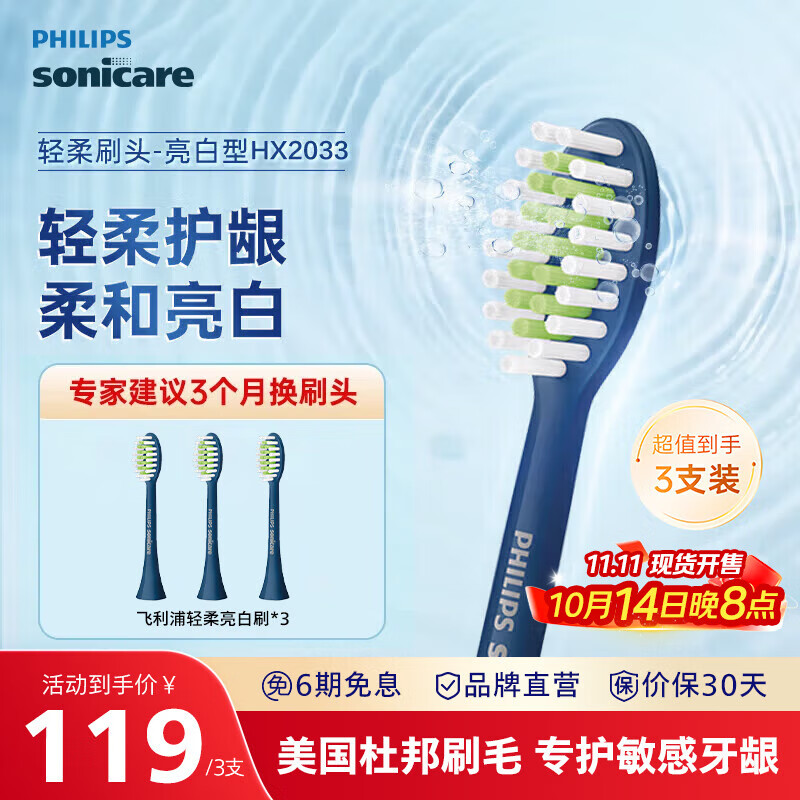 飞利浦(PHILIPS)电动牙刷头柔和亮白刷头适配5效宝藏刷HX2471系列亮白 官方旗舰店 柔和亮白3支装-深藏BlueHX2033/03