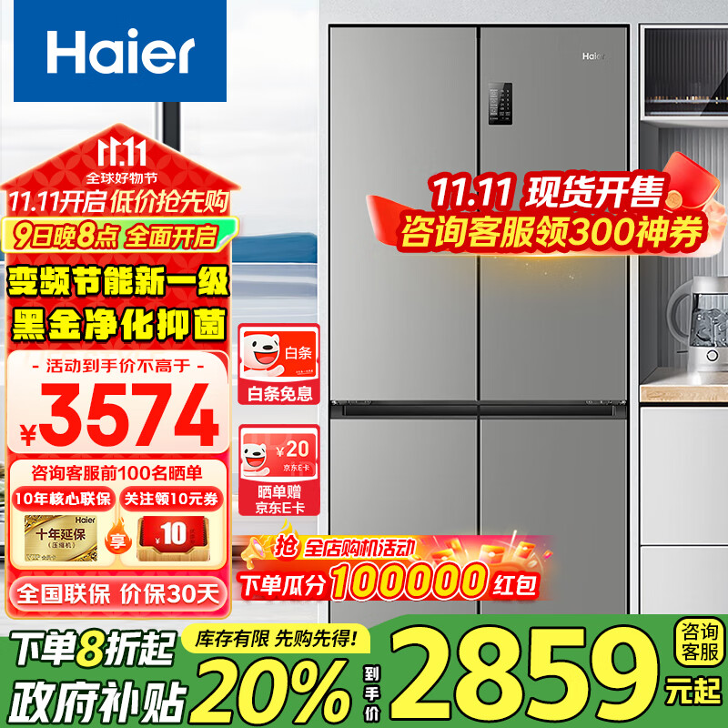 海尔(Haier)冰箱四开门539升十字对开门家用智能双变频大容量三档变温空间一级能效电冰箱 539L铂岩灰+母婴专属空间+黑金净化