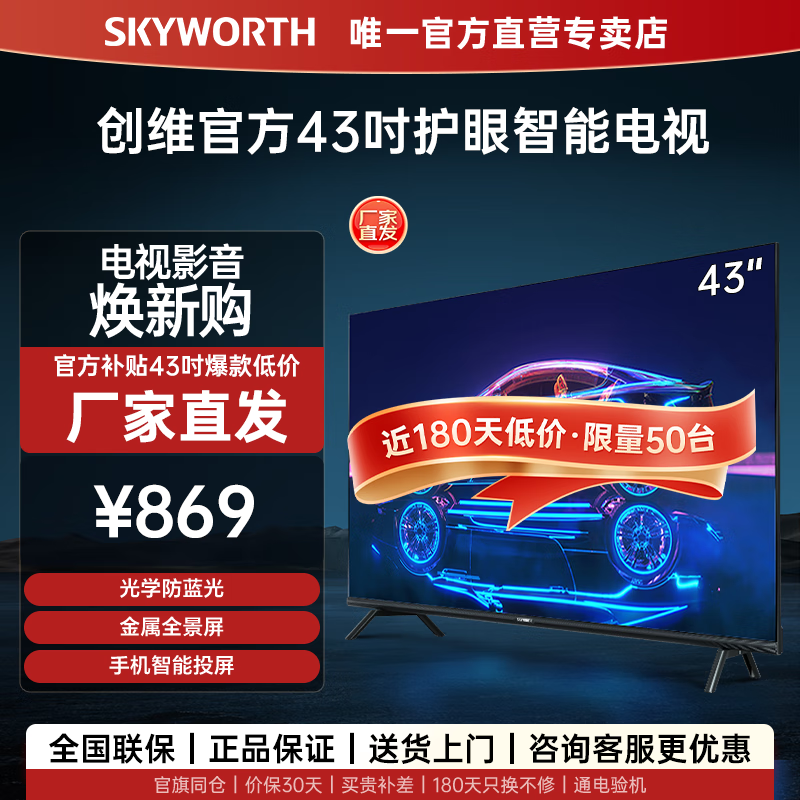 创维平板电视机43寸 健康护眼光学防蓝光 全高清金属全面屏液晶平板电视机43吋 国家补贴 H3升级款 43英寸 电视【官方直营】