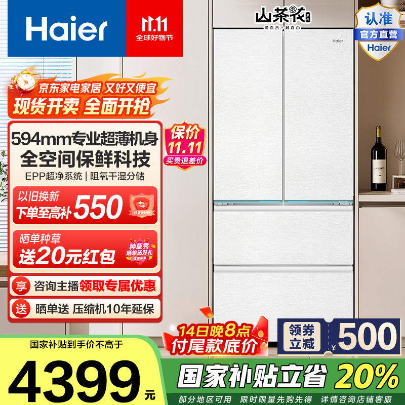 Haier/山茶花485升超薄零距离自由嵌入全空间保鲜风冷无霜一级变频家用电冰箱法式四开门国家补贴20% BCD-485WGHFD1BWLU1