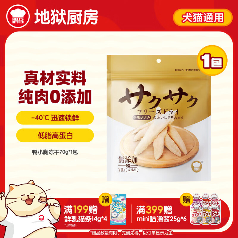 地狱厨房(Hell's Kitchen)宠物猫零食鸭胸肉无添加猫咪狗狗通用营养零食鸭小胸冻干70g*1包