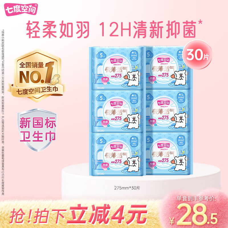 七度空间极薄透气线条小狗IP款抑菌加长日用组套275mm30片【新国标认证】