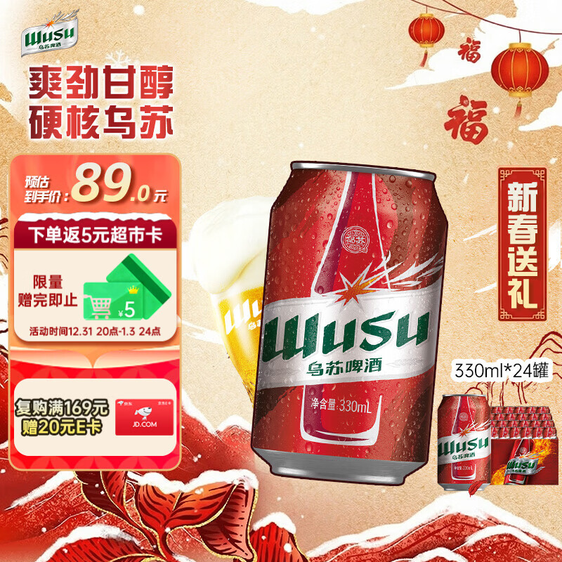乌苏啤酒(wusu)京东自营大红乌苏烈性啤酒330ml*24罐/箱整箱装新春送礼