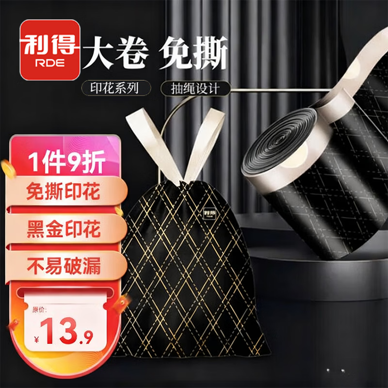 利得抽绳垃圾袋黑金印花45*50cm100只单面1丝免撕印花加厚厨房垃圾袋