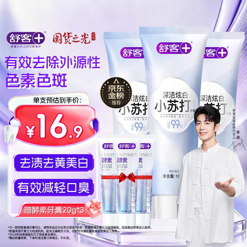 舒客小苏打牙膏 美白牙齿减轻口臭含氟防蛀 3支共480g薄荷味 新老随机