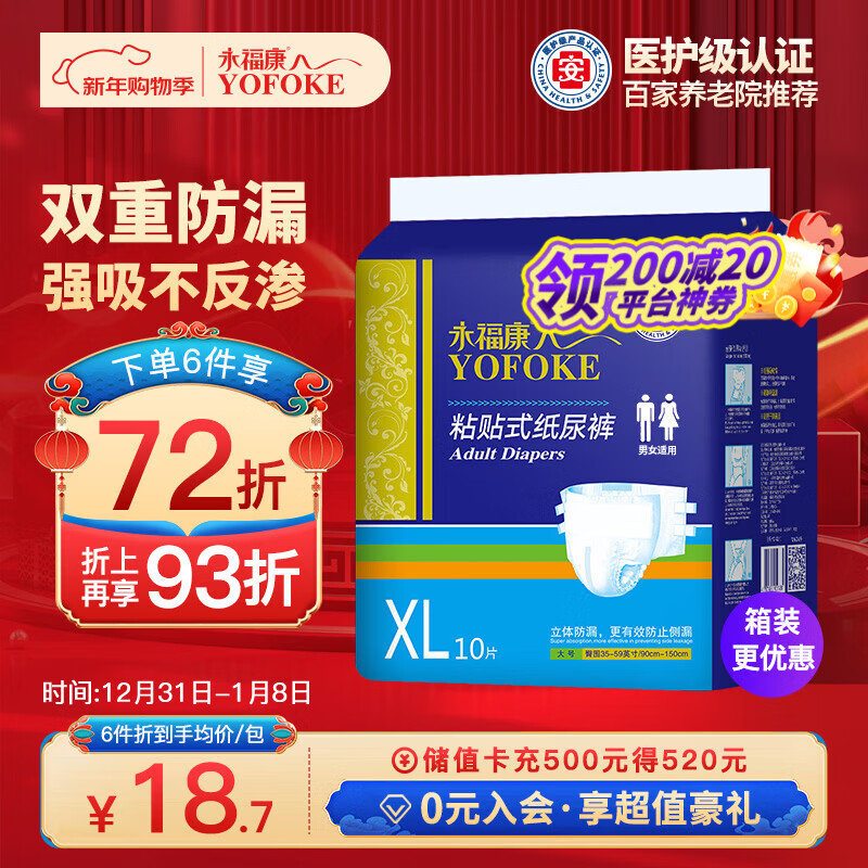 永福康成人纸尿裤 XL10片 臀围≥110cm 老人尿不湿 孕产妇粘贴式纸尿裤