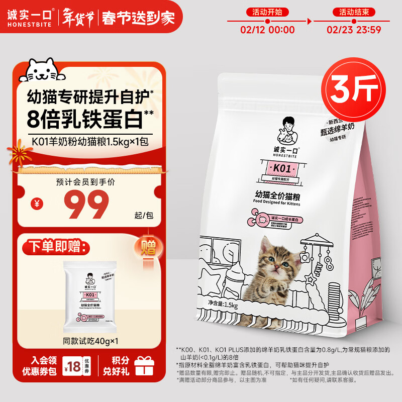 诚实一口K01全价猫粮幼猫孕猫专用乳铁蛋白新西兰绵羊奶1.5kg