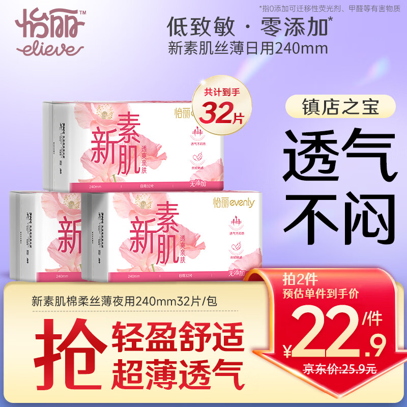怡丽医护级卫生巾超薄低致敏日用240mm32片京东自营官方旗舰店姨妈巾