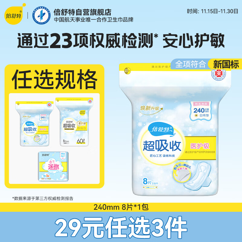 倍舒特超吸收 棉柔瞬吸防漏日用卫生巾 240mm8片 京东自营姨妈巾