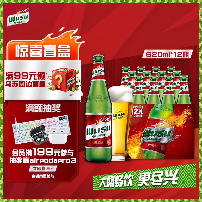 乌苏啤酒(wusu)京东自营大红乌苏烈性啤酒620ml*12瓶整箱装婚宴热门商品