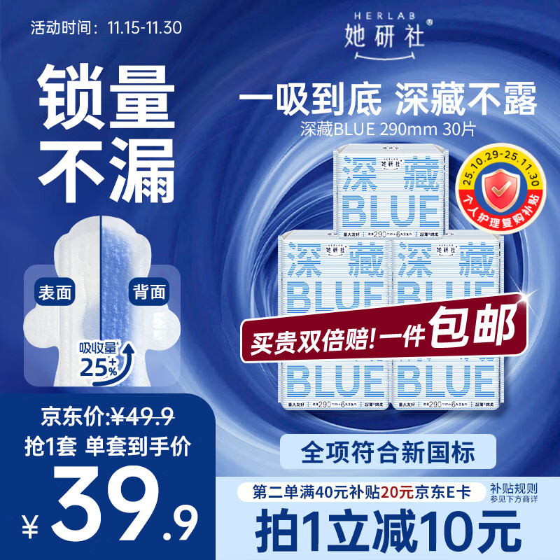 她研社深藏blue卫生巾套装日/夜组合290mm*30片超薄透气姨妈巾京东自营