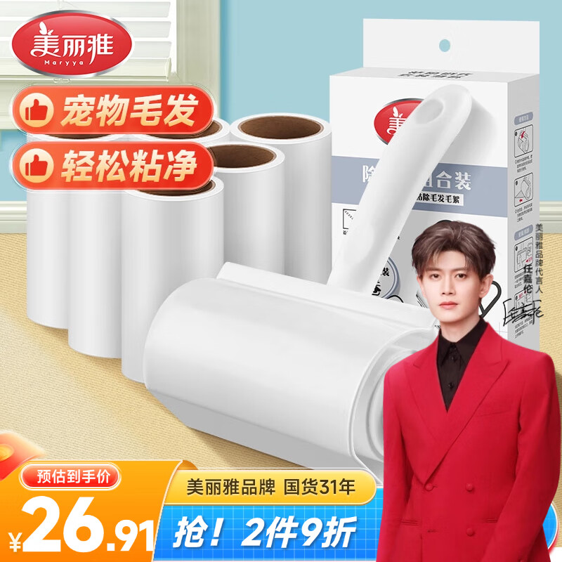 美丽雅粘毛器滚筒7卷替换纸共420撕沾毛神器衣服猫毛地毯清理宠物毡毛刷