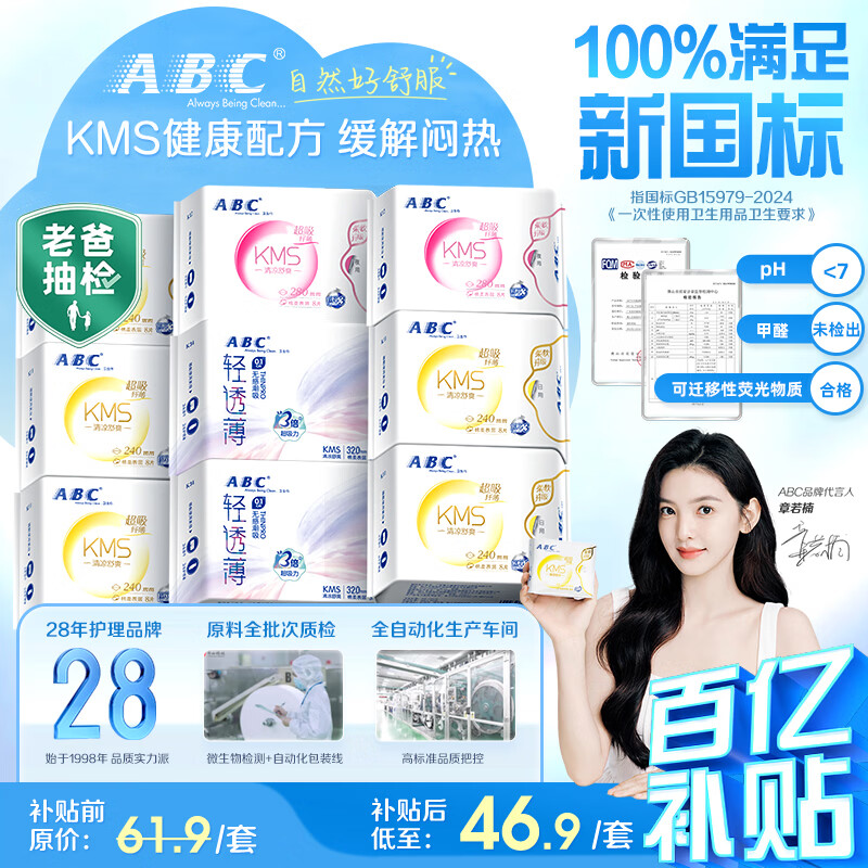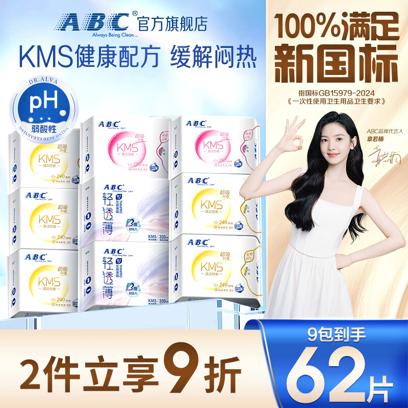 ABCKMS纤薄健康配方超薄透气日夜卫生巾套装京东自营9包62片