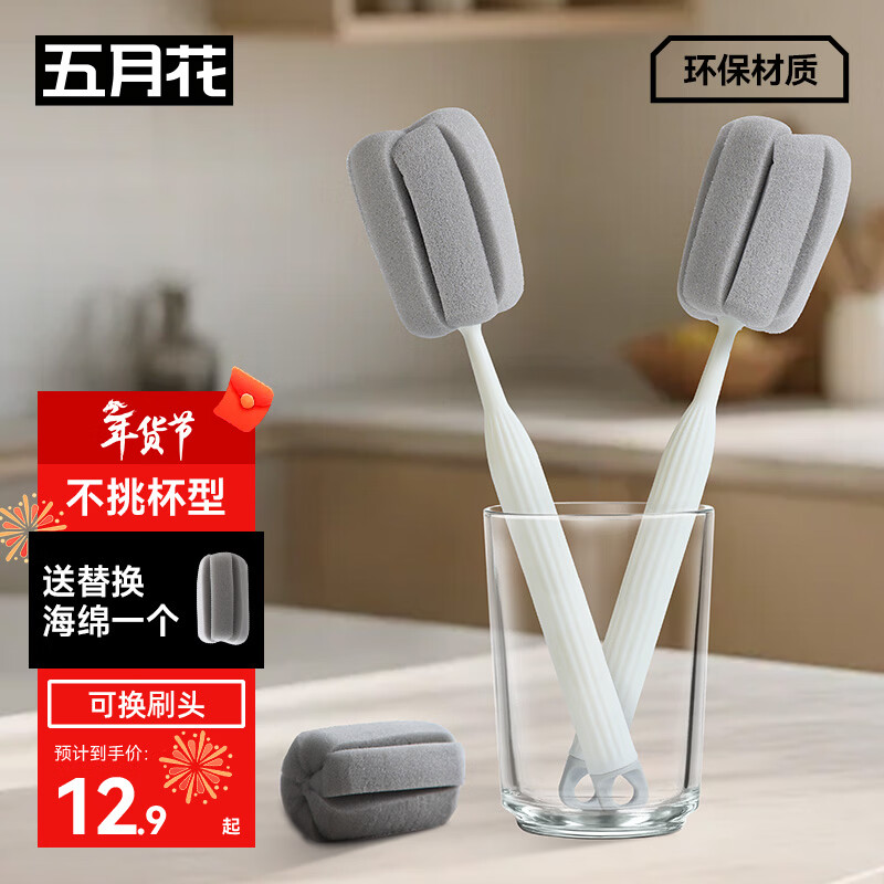 五月花杯刷强力去污不伤手清洁刷去油污长柄可立式海绵小刷子2个配头