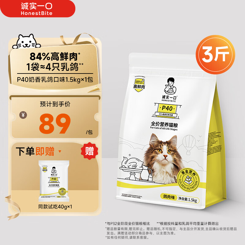 诚实一口P40全价猫粮 成猫幼猫84%高鲜肉长肉美毛养胃乳鸽口味通用型1.5kg