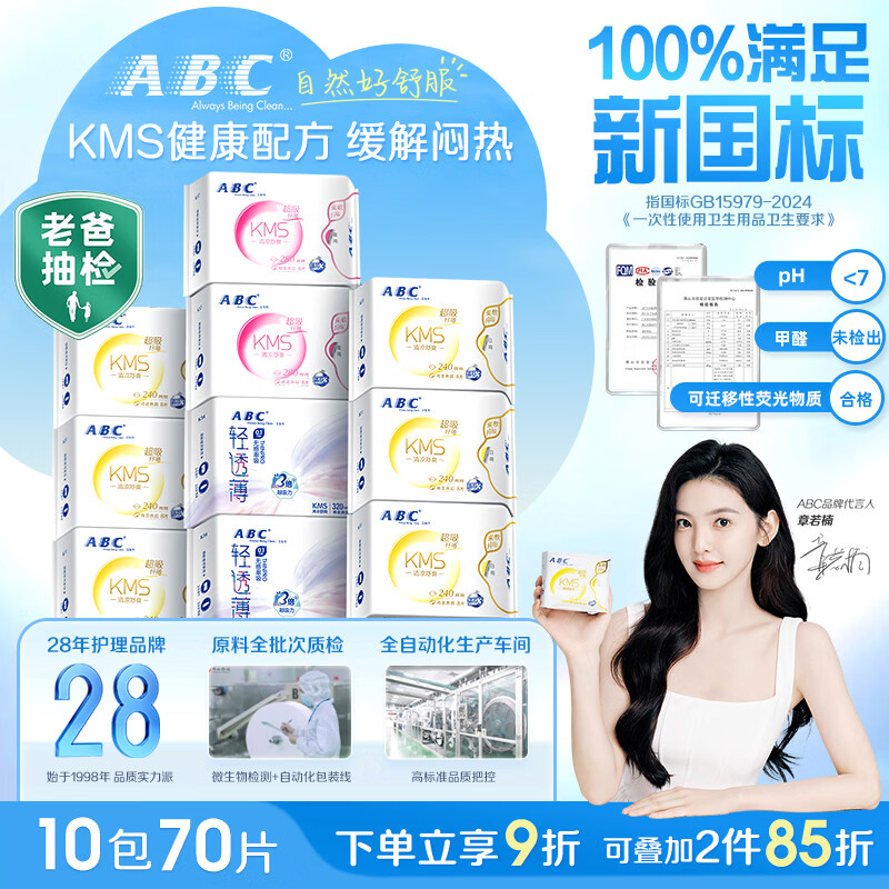 ABCKMS纤薄健康配方超薄透气日夜卫生巾套装京东自营10包70片